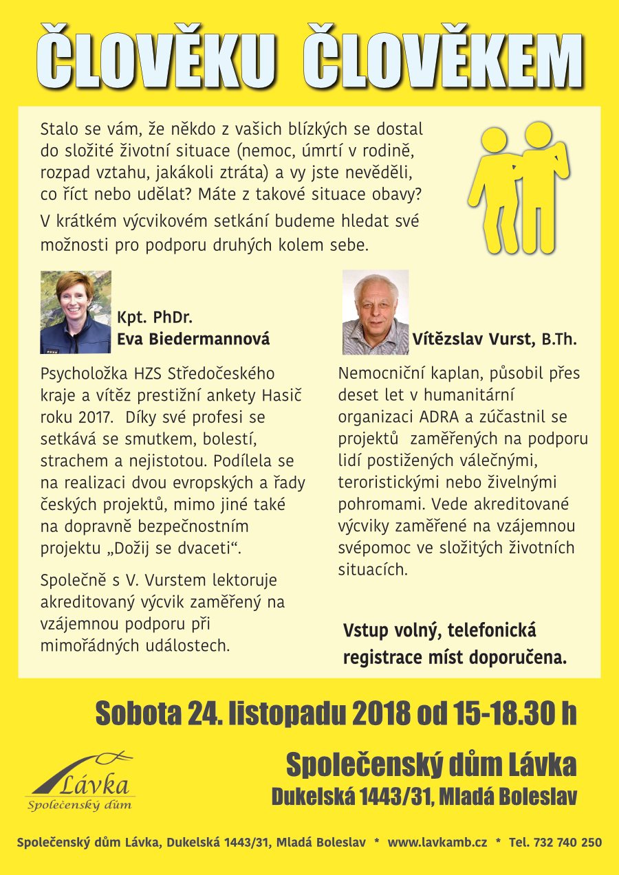 Sobota 24. listopadu v 15 h – ČLOVĚKU ČLOVĚKEM, výcvik zaměřený na vzájemnou svépomoc ve složitých životních situacích.